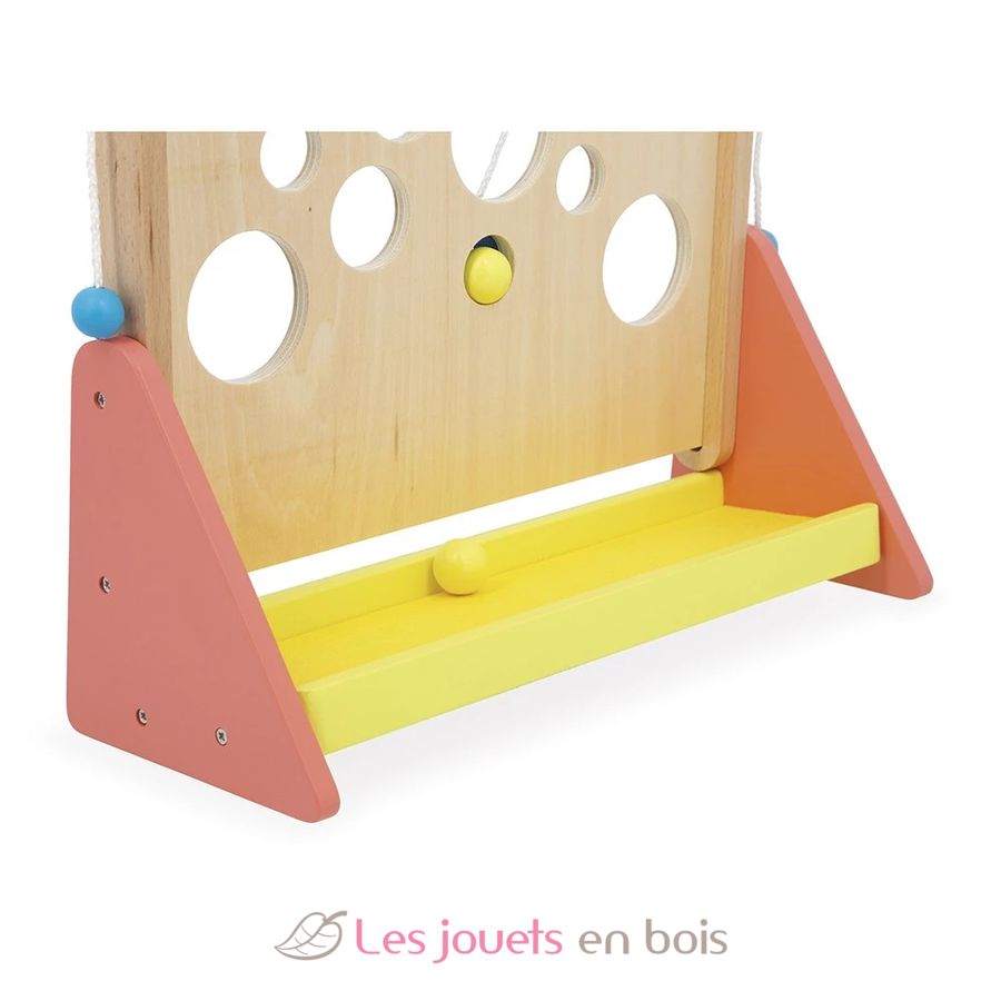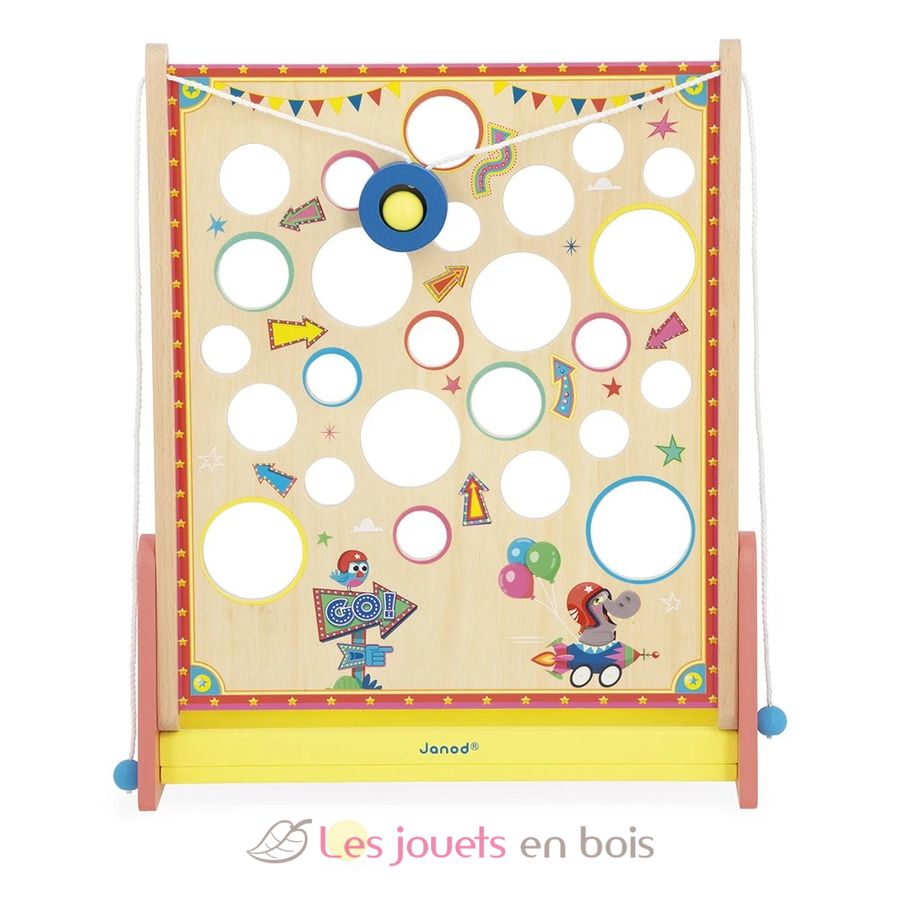 Le but de ce jeu d’adresse vertical est simple : en tirant sur les cordes situées sur les côtés du support, vous faites progressivement monter la bille à l’intérieur de la plateforme pour attendre le haut du parcours … Mais attention aux trous, c’est un véritable labyrinthe !